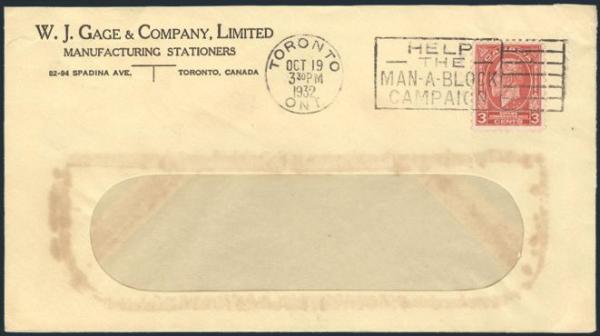 5650 192 image192, Ottawa Conference 3¢ tied by Toronto 19 Oct 1932 slogan cancel to a W.J. GAGE window envelope. The stamp has a "WJG" PERFIN. F (Image) Estimate 40.00+ $Cdn