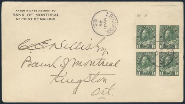 5639 137 image137, Sheet margin imperforate 2¢ Admiral block neatly cancelled by Liverpool NS 31 May, 1926 CDS on cover to Kingston Ont. Has Bank of Montreal corner card. VF, centre crease not affecting the stamps (Image) Estimate 200.00+ $Cdn