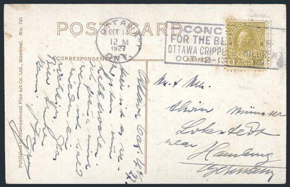 5632 110 image110, Collection of three Admiral 4¢ postcards 1926-7 to Foreign destinations - Germany, Denmark & France. Each depicts a diff scene in Canada. F (3) (Image) Estimate 85.00+ $Cdn