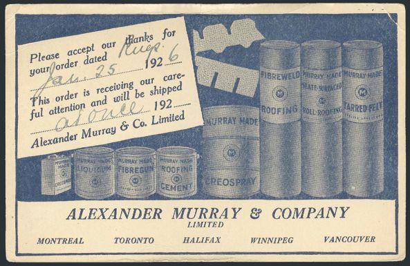 5626 105 image105, Tied by Toronto 28 Jan 1926 slogan cancel on blue illustrated advertising postcard for Alexander Murray & Co. roofing materials. Addr to Blind River, Ont. Depicts roofing products. F-VF, bit of edge wear (Image) Estimate 50.00+ $Cdn