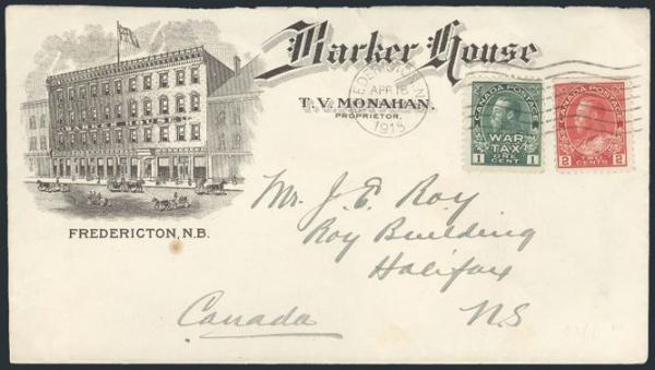 5628 106, MR1 image106, MR1, Tied by Fredericton, NB 16 Apr 1915 cancel on Barker House Hotel illustrated advertising cover to Halifax, NS. VF, no back flap (Image) Estimate 80.00+ $Cdn