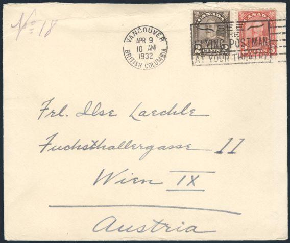 5646 166-7 image166-7, Tied by Vancouver BC 9 Ap, 1932 "Flying Postman" slogan cancel on cover to VIENNA AUSTRIA. Has Canadian Pacific Steamship Line imprint on back flap. F, bit roughly opened at top (Image) Estimate 50.00+ $Cdn