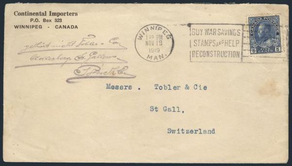 5635 111 image111, Tied by Winnipeg WWI related Patriotic slogan cancel 19 Nov 1919 to SWITZERLAND. Has Continental Importers corner card. F (Image) Estimate 50.00+ $Cdn