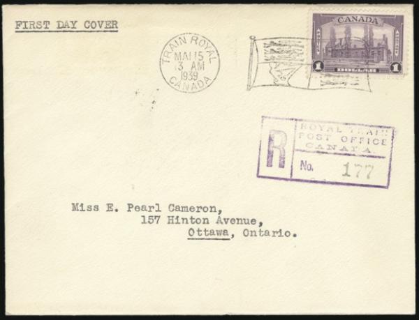 Chateau tied by TRAIN ROYAL 15 Mai, 1939 cancel (in French) on Reg'd ROYAL TRAIN cover to Ottawa. Has 2 additional Train Royal and Montreal b/s's. F. SCARCE FRANKING