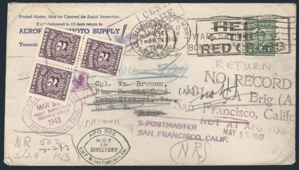 by Toronto 1943 slogan cancel on WWII cover to a soldier at Camp Stewart Ga, USA. Then redirected to San Francisco with various handstamps & markings. The soldier was never found and the cover was returned back to the sender. A Postage Due of 1¢ was