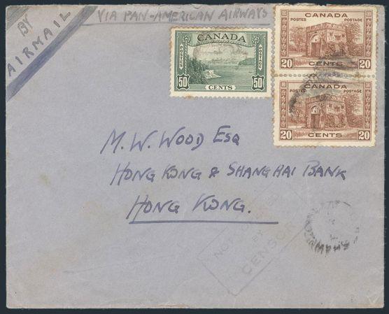 244, Tied on Shawnigan Lake School airmail cover with m/s VIA PAN-AMERICAN AIRWAYS. Addr to HONG KONG. Has Shawnigan Lake BC cancel and light violet boxed "NOT OPENED BY CENSOR" h/s. F (Image)