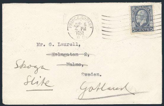 single franking KGV 5¢ Medallion tied by Prince Rupert BC 6 July 1938 cancel on cover to SWEDEN (where it was redirected to Gotland, a small island off the mainland). F