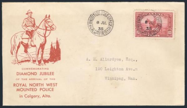 Mountie tied by Exhibition Post Office, Calgary Alberta 8 July, 1935 CDS on illustrated cover. Has cachet for the Diamond Jubilee of the arrival of the ROYAL NORTH WEST MOUNTED POLICE in Calgary. F (Image)