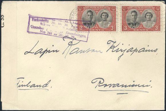 Tied by Three Rivers PQ cancel on WWII Censored cover to FINLAND. Has violet boxed Finnish h/s dated 20 Oct, 1939 - very early date at the beginning of the war. VF