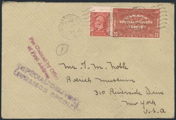 Tied by Montreal 10 Apr 1934 duplex cancels on Special Delivery cover to New York. Has violet "SPECIAL DELIVERY" bilingual h/s & purple "Fee Claimed by Office / of First Address" USA h/s. F-VF (Image)