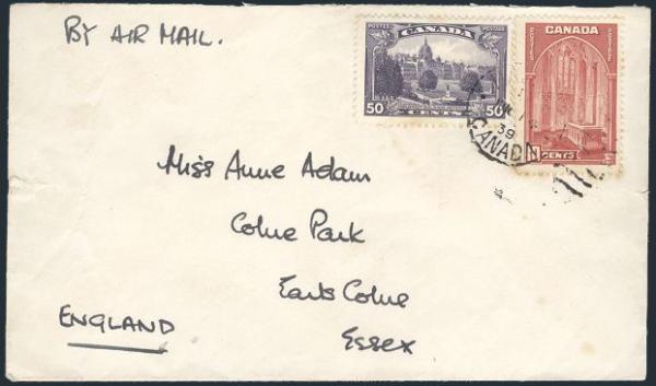 Tied by Halifax 14 June 1939 cancel on Trans-Atlantic cover to England. Scarce 50¢ Victoria franking. F, minor bit of TS (Image)