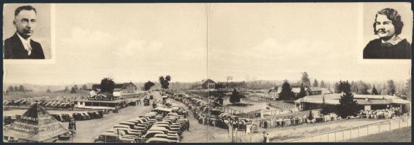 by Callader Ont 1937 CDS on fold-out double b/w 'Giant' postcard depicting the HOME OF THE DIONNE QUINTUPLETS, parking area full of cars, hundreds of people standing in line to view the Quints along with inset portraits of the parents. "Quintland"