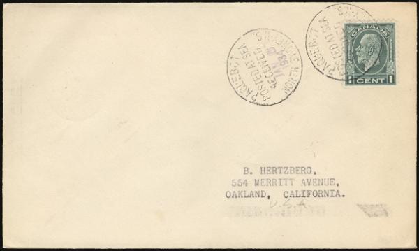 by Coppermine, NWT 25 July 1938 CDS on "FIRST COVER NORTH WEST PASSAGE ROUTE (WEST to EAST) CERTIFIED R.W. HALE POSTAL SUPT" addr to Major Hale, Edmonton, Alta. Has Fort Ross, NWT; Ivigtut Greenland CDS; & blue oval "EASTERN ARCTIC / MAIL / SERVICE /