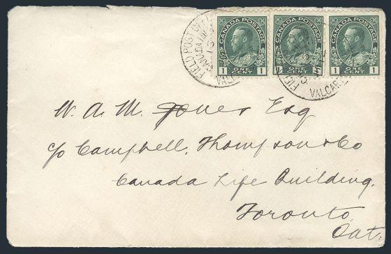 Tied by 2 strikes of VALCARTIER CAMP PQ Field Post Office 14 June, 1915 on cover to Toronto. F, no back flap (Image)
