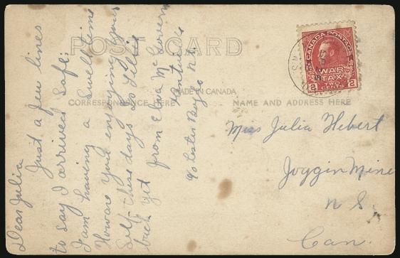 by Aldershot NS Military Camp 26 Sp 1918 to a postcard addr to Joggin Mine NS. Depicts a b/w real photo view of the Aldershot Camp. F, toning / age spots. VERY LATE USAGE AS THE CAMP CLOSED A COUPLE WEEKS LATER. Ex Firby (Image)