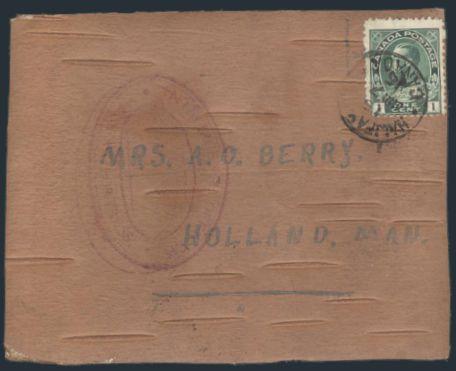 by Halifax 7 June, 1916 CDS on a BIRCH BARK POSTCARD, addr to Holland, Manitoba (rec b/s). Has scarce large red double-ring oval "INTELLIGENCE OFFICER / HALIFAX FORTRESS" h/s (this scarce handstamp is listed by Bailey & Toop #M8-10, under POW &
