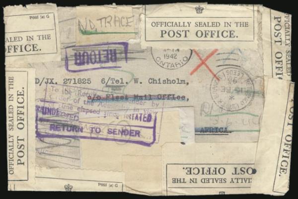travelled WWII cover from Windsor Ont 28 Dec 1942 to Africa care of Fleet Mail Office. Forwarded to diff addresses but the addressee was never found. Has multiple directional notations, h/s's, 'RETOUR', 'PORT INDEX OFFICE' b/s, etc. Has been