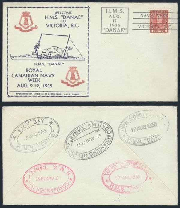 by "H.M.S. / DANAE / NAVY WEEK / VICTORIA, BC, 17 Aug 1935 slogan cancel on cach special event cover. Has 5 more diff oval Danae ship cancels on back. VF, unaddr. Attractive