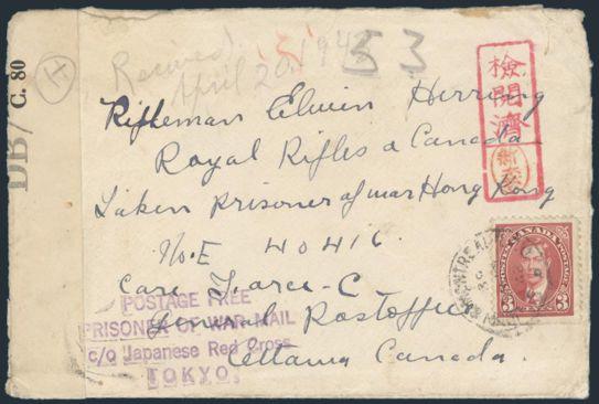 by St John & Montreal 10 May, 1942 RPO cancel on WWII cover to Rifleman Edwin Herring, taken Prisoner of War at Hong Kong, care of Force C, Ottawa. Has violet 4-line "POSTAGE FREE / PRISONER OF WAR MAIL / C/O JAPANESE RED CROSS / TOKYO". Has Censor
