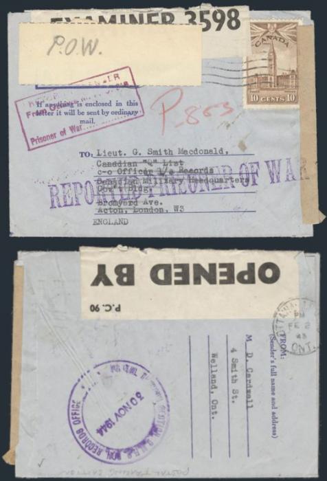 on 1944 Air Letter from Welland Ont addr to a Lieut on Canadian "Q" List, London, England. Has large violet "REPORTED PRISONER OF WAR" straightline and purple boxed "RETURNED TO SENDER FROM OTTAWA MPO 318 PRISONER OF WAR.". Has Censor tapes and