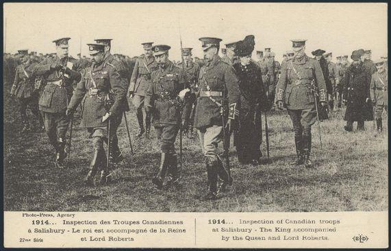 b/w photo postcard depicting the Inspection of Canadian Troops at Salisbury by KGV, QUEEN MARY, LORD ROBERTS & STAFF. VF (Image)