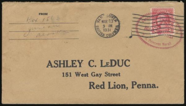5815 S-28 imageS-28 (RF 195), Vancouver - Skagway R.P.O. / S.S. Princess Norah / 13 Mar 1931 red oval cancel tying USA #554 on business reply cover to USA. F (Image) Estimate 65.00+ $Cdn