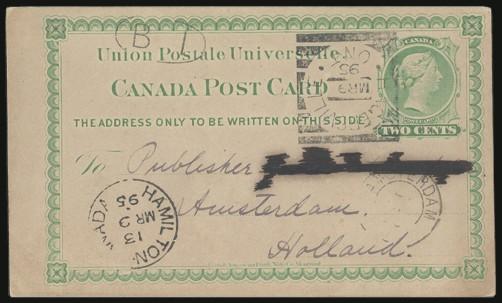 5825   imageHAGERSVILLE ONT (RF 20) VF strike 9 Mr, '95 on QV 2¢ UPU postal card to AMSTERDAM HOLLAND. A nice strike and a nice destination. F, toned (Image) Estimate 75.00+ $Cdn