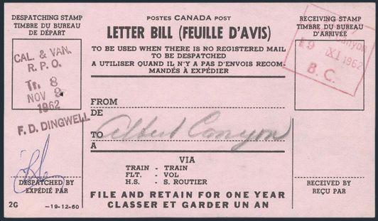 5821   imageLudlow #W-26N (RF390), VAN. / R.P.O. / Tr / 1962 purple cancel on LETTER BILL to Albert Canyon, BC. VF. Seldom seen RPO (Image) Estimate 125.00+ $Cdn