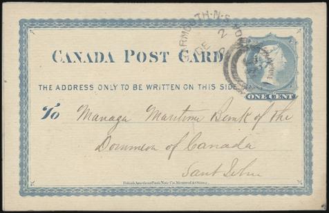 5806 P1 imageP1, QV 1¢ postal card with a scarce strike of the Yarmouth 2-ring '18', addr to St. John NB. Has Yarmouth NS 2 Dec 1872 CDS alongside. Unitrade notes that most known strikes of this cancel are poor, this one is quite decent. F (Image) Estimate 150.00+ $Cdn