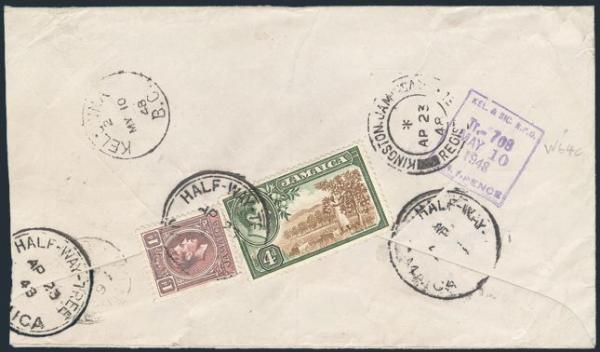 5817 117, 122 imageWT-301, KEL. & SIG. R.P.O./ E.R. SPENCE, RF-F, Violet strike on back of Reg'd cover from Jamaica 23 Apr 1948 to Kelowna, BC, Canada. Customs etiquette tied. F, a bit reduced. Scarce (Image) Estimate 75.00+ $Cdn