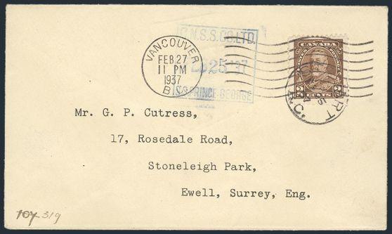 5820 Ludlow #S-112a imageLudlow #S-112a (RF 315), blue boxed C.N.S. CO. LTD./ S.S. PRINCE GEORGE 25 Feb 1937 struck front & back on cover from Stewart, BC, via Vancouver to England. F-VF, small tear on reverse (Image) Estimate 90.00+ $Cdn