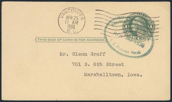 5819 Ludlow #S-28 imageLudlow #S-28 (RF 195) Vancouver-Skagway R.P.O. / S.S. Princess Norah 23 Apr 1936 green oval cancel on USA 1¢ postal stationery card from Vancouver to Marshalltown, Iowa. VF (Image) Estimate 60.00+ $Cdn
