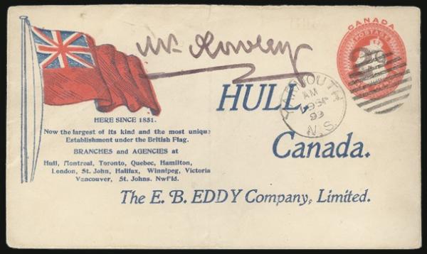 5808 U14a imageU14a, QV 2¢ surcharged postal stationery return envelope for the E.B. Eddy Co. of Hull. Has lovely patriotic design with the Canadian Flag. Used from Yarmouth NS 19 Sp, 1899. F, centre fold / small edge tear (Image) Estimate 75.00+ $Cdn