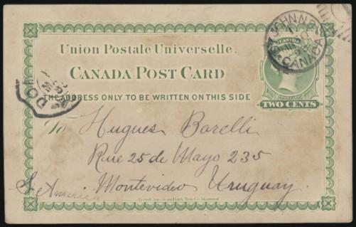 5809 UX4 imageUX4, QV 2¢ green postal stationery card used from St. John NB 30 Mr 1893 to MONTEVIDEO URUGUAY (partial rec cancel). F, some toning (Image) Estimate 175.00+ $Cdn