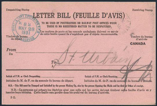 5814 QC165 imageQC165 (RF F) MONT. & FT. COVINGTON R.P.O. / F.P. GERVAIS / Tr 82 28 May 1931 blue 2-Ring strike on PO Letter Bill Advice to St. Urban. VF (Image) Estimate 75.00+ $Cdn