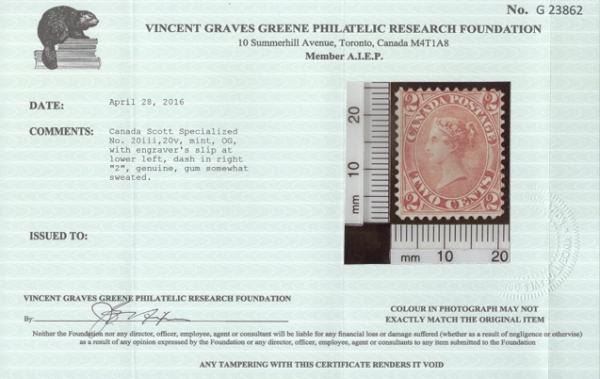 Crisply printed mint copy of the 2¢ rose with both the ENGRAVER'S SLIP at lower left & DASH IN RIGHT "2" varieties. An interesting item! F, OG, sweated gum. Has 2016 Greene Foundation Certificate (Image) (View Certificate)