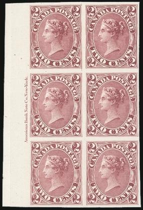 margin Plate Proof block of 6 on card with FULL PLATE INSCRIPTION. One stamp with dash in LR "2" and another stamp shows the ENGRAVER'S SLIP. VF. A LOVELY SHOWPIECE