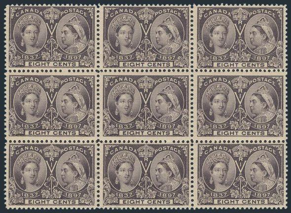 6110 56 image56, Beautiful block of 9, fresh rich colour, nice centering. Cat value listed as 3 stamps VF, NH and 6 stamps F-VF, NH. Two stamps with minor gum bends. RARELY SEEN IN SUCH A NICE MULTIPLE (Image) Cat 3,960.00
