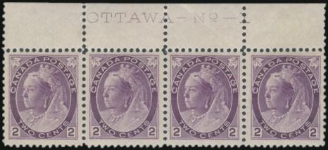 margin Plate 1 Imprint strip of 4. Beautiful centering, rich colour, VF, one tiny facial spot (Image)