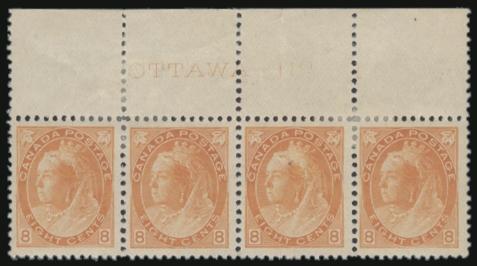 Nicely centred Plate 1 Imprint strip of 4. The second stamp shows the scarce MAJOR RE-ENTRY in the word "CENTS". VF, 3 stamps incl variety are NH, a few separated perfs in selvedge only. A RARE PLATE IMPRINT MULTIPLE (Image)