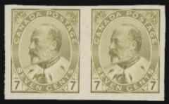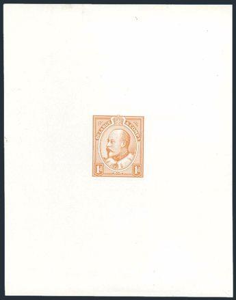 6233   imageRare KE 1903 One Penny "CANADA HEAD" ESSAY printed by De la Rue in pale orange on thick wove glazed paper (87 x 107 mm). The design is in a similar style to that of the Canada Edward VII issue (Scott #89-95). VF. Ex Minoru (SG Cat £3,250) (Image) Estimate 1,250.00+ $Cdn