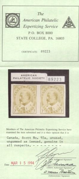 6243 92a image92a, IMPERF PAIR of the KE 7¢. Fresh, full margins, VF. Has 1994 APS Certificate (Image) (View Certificate)