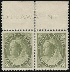 6244 92ii image92ii, Olive yellow top margin strip of 8 with full OTTAWA PLATE #2 IMPRINT. A very pretty showpiece. Fresh, F, stamps are NH (Image) Cat 2,880.00
