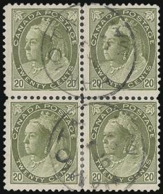 6228 84 image84, Nice block of the 20¢ Numeral with neat Hamiota Man 3 Oct 1903 CDS's. F-VF, a few reinforced perfs. A VERY RARE USED BLOCK (Image) Estimate 350.00+ $Cdn