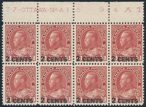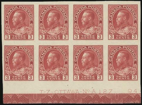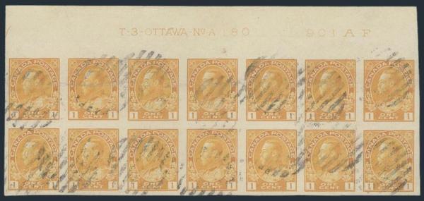 6359 136 image136, A spectacular top margin Plate #180 block of 14 with full imprint & serial number. A wonderful block with intense colour, neat grid cancels. VF, light horiz crease (Image) Estimate 500.00+ $Cdn