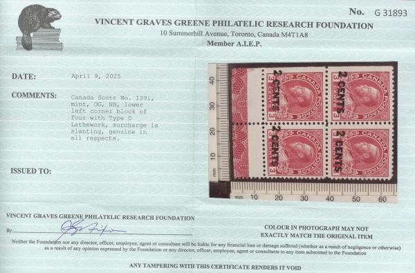 6375 139i image139i, LL corner block with SLANTING SURCHARGES variety and full TYPE D LATHEWORK. Has cutting arrow at bottom left. Fresh, F-VF, NH. Has 2025 Greene Foundation Certificate. A SCARCE ADMIRAL SHOWPIECE FOR AN EXHIBIT (Image) (View Certificate)