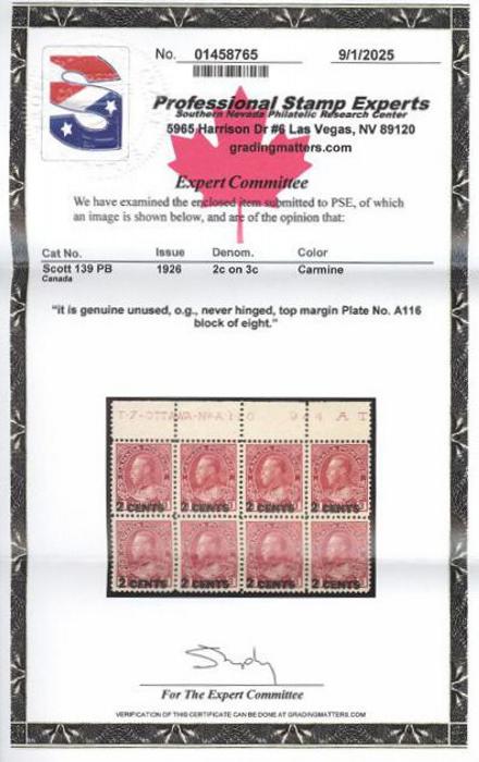 6371 139 image139, Top Plate No. A116 Block of 8, nicely centered, deep rich colour, VF, NH. Has 2025 PSE Certificate. A CHOICE ITEM (Image) (View Certificate)