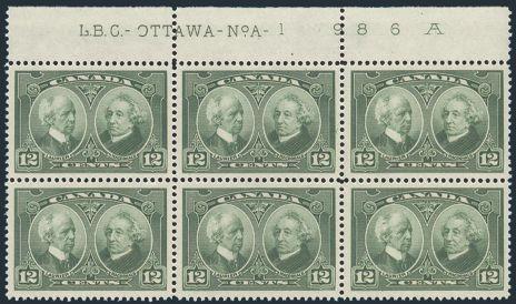 margin Plate #A1 imprint block of 6, pristine fresh, VF, stamps are NH (and Cat listed is for the stamps) (Image)