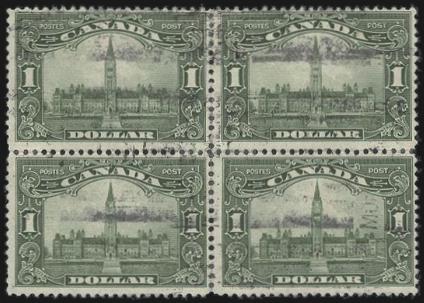 6439 159 image159, Used block of the $1 Parliament, F-VF, light Montreal roller cancel (Image) Estimate 150.00+ $Cdn