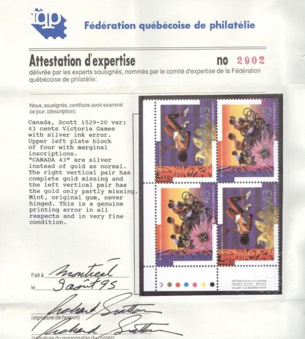 Plate Block with SILVER INSCRIPTIONS (instead of gold) on the right vertical pair and partially on the left vertical pair. VF, NH. Has 1995 FQP Certificate and other information. Ex Saskatoon Stamp Centre. VERY FEW EXIST AND THIS IS THE ONLY ONE LIKE